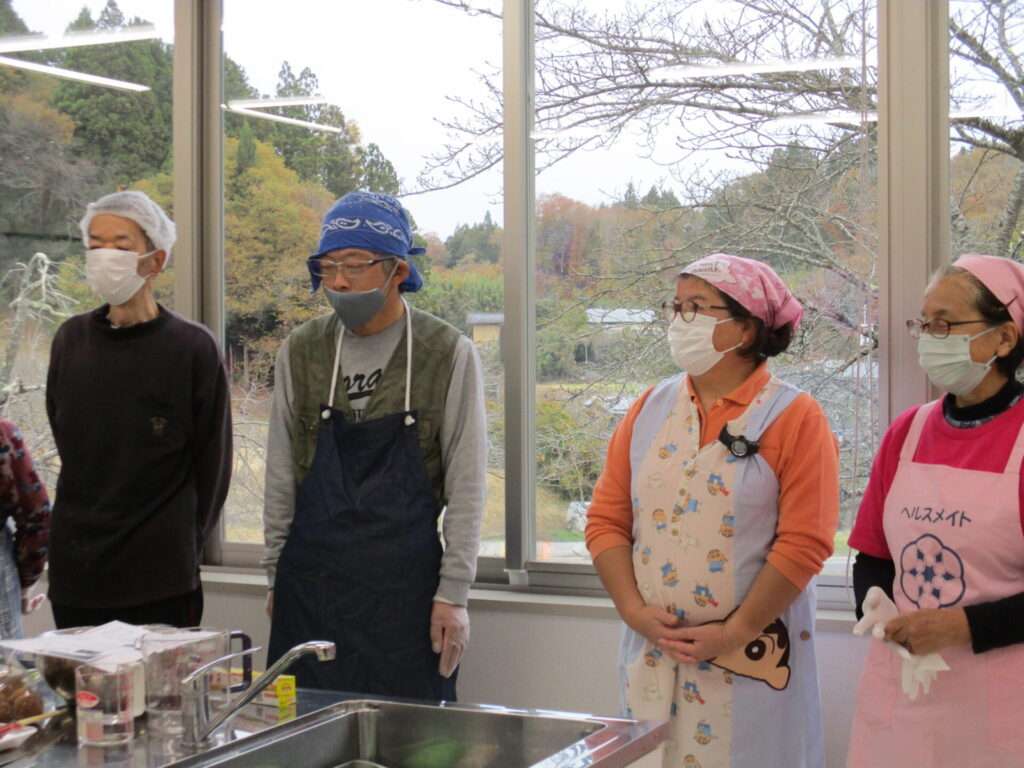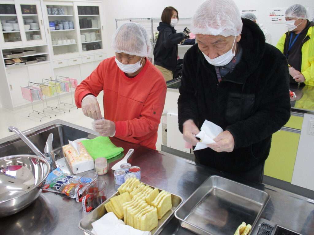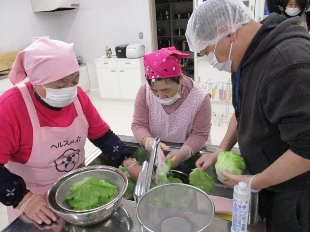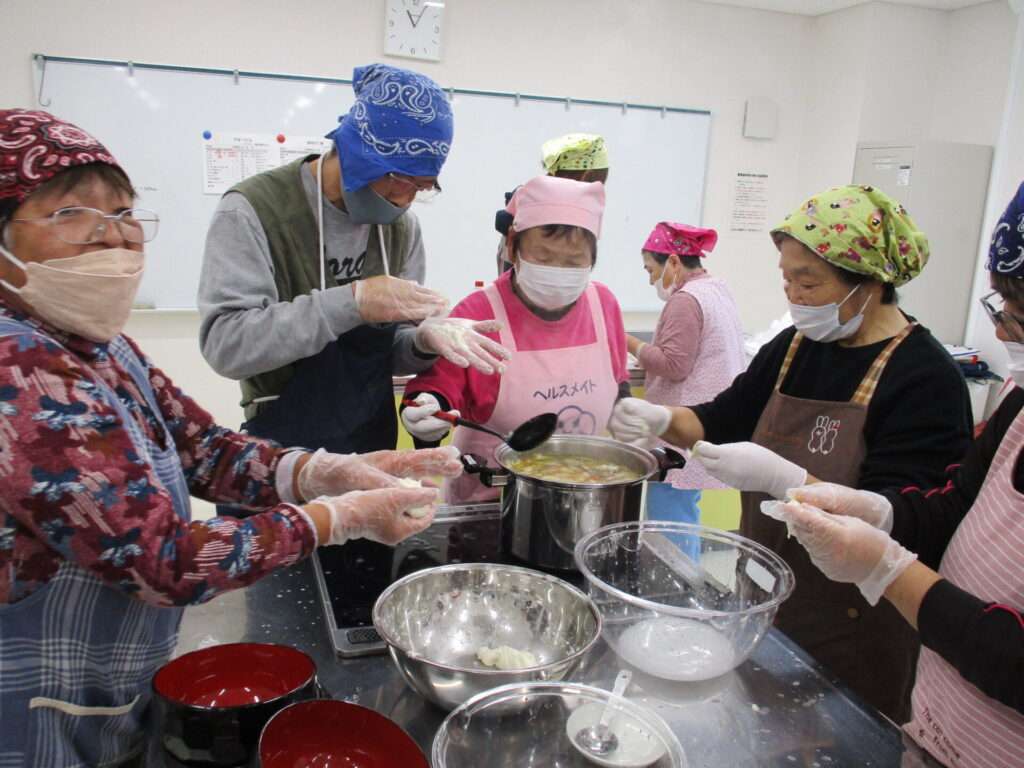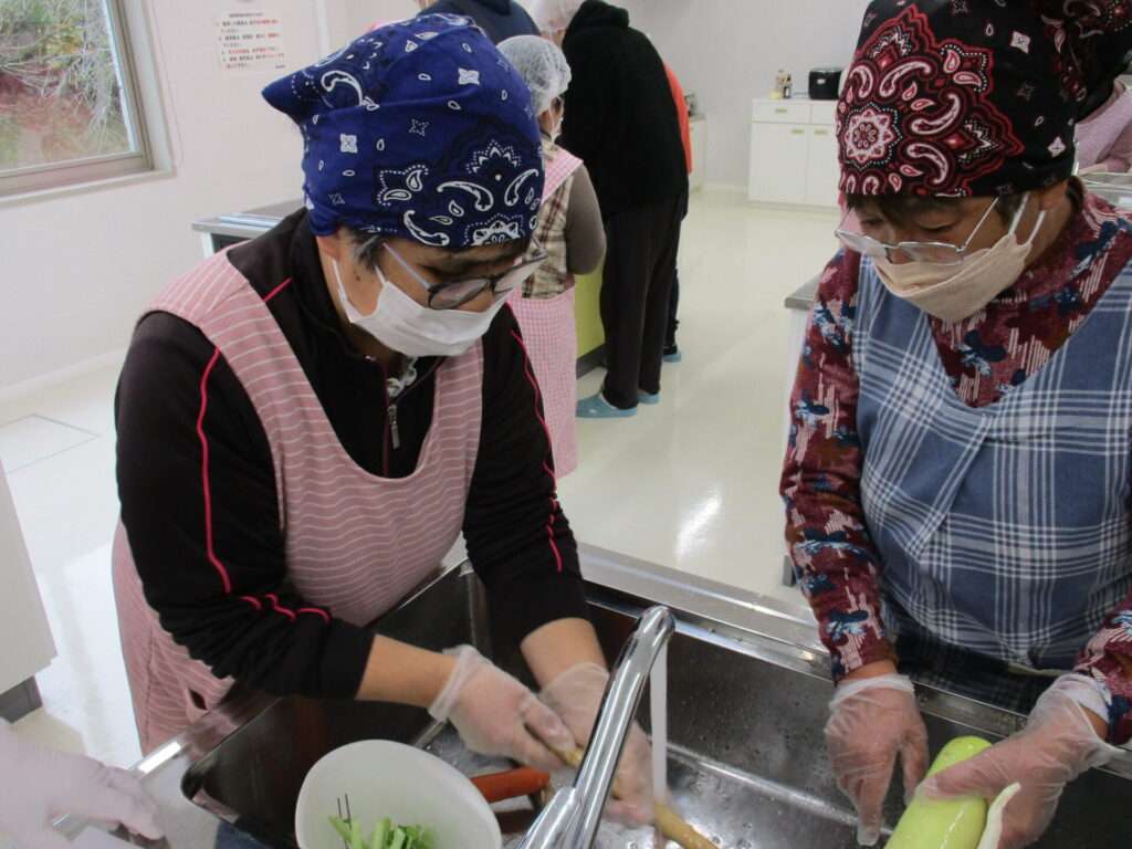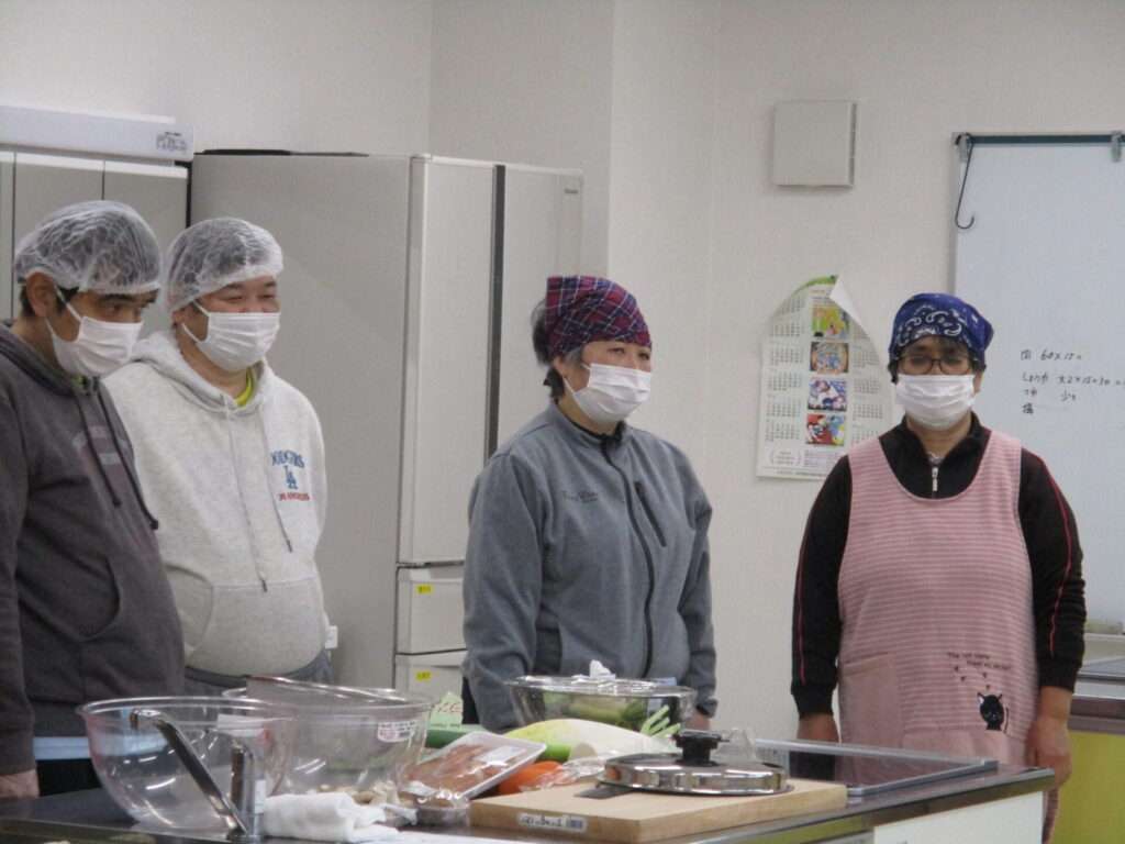 挨拶を経て食生活改善推進員の方々と一緒に調理を行う利用者たち