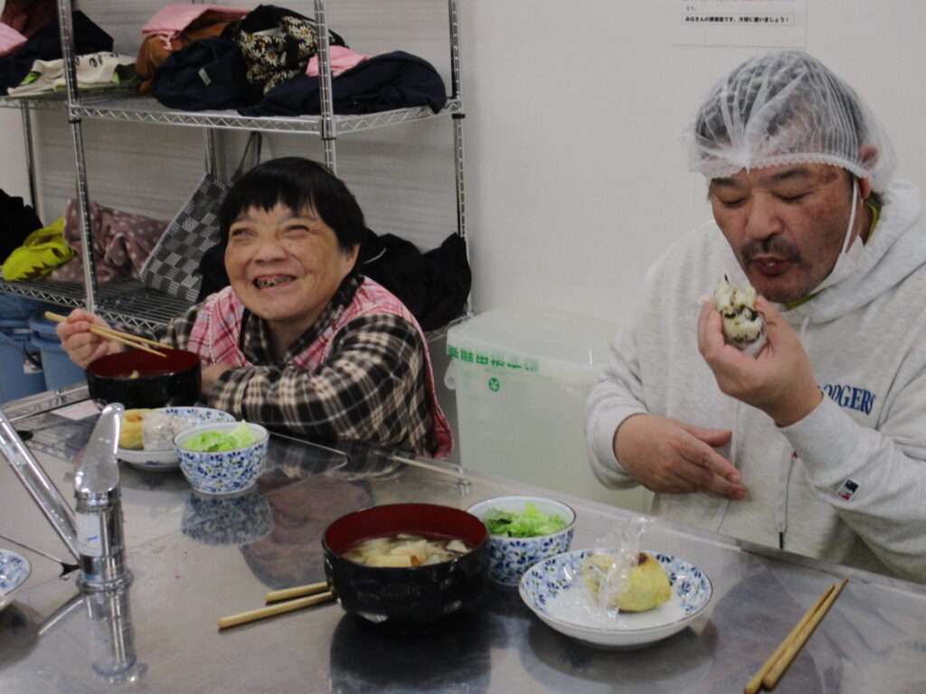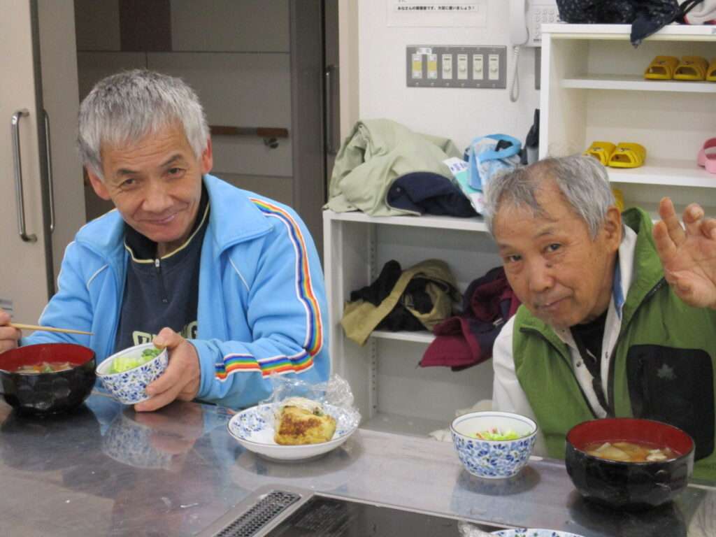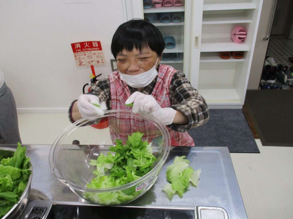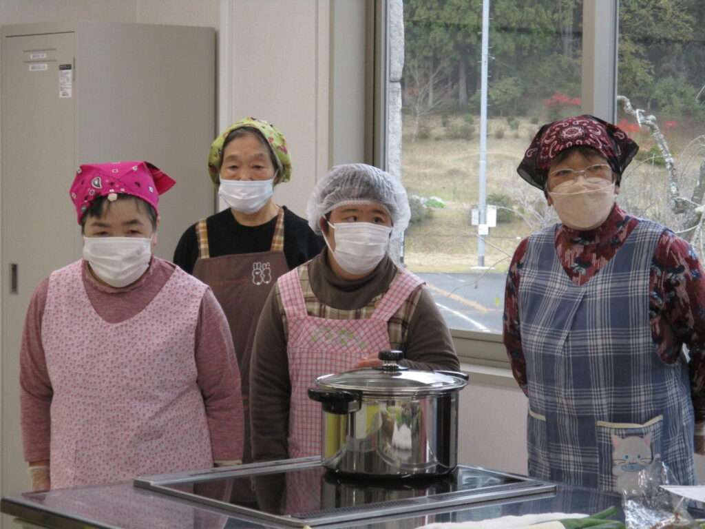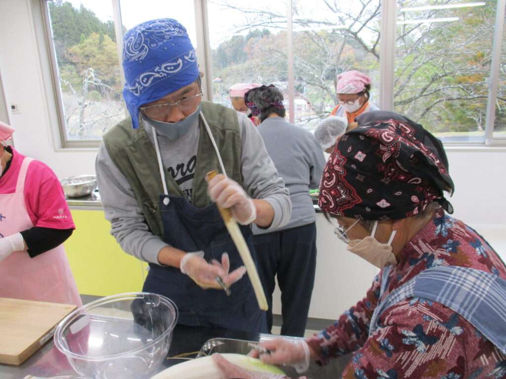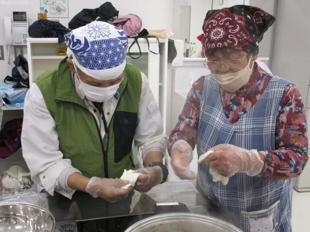 挨拶を経て食生活改善推進員の方々と一緒に調理を行う利用者たち